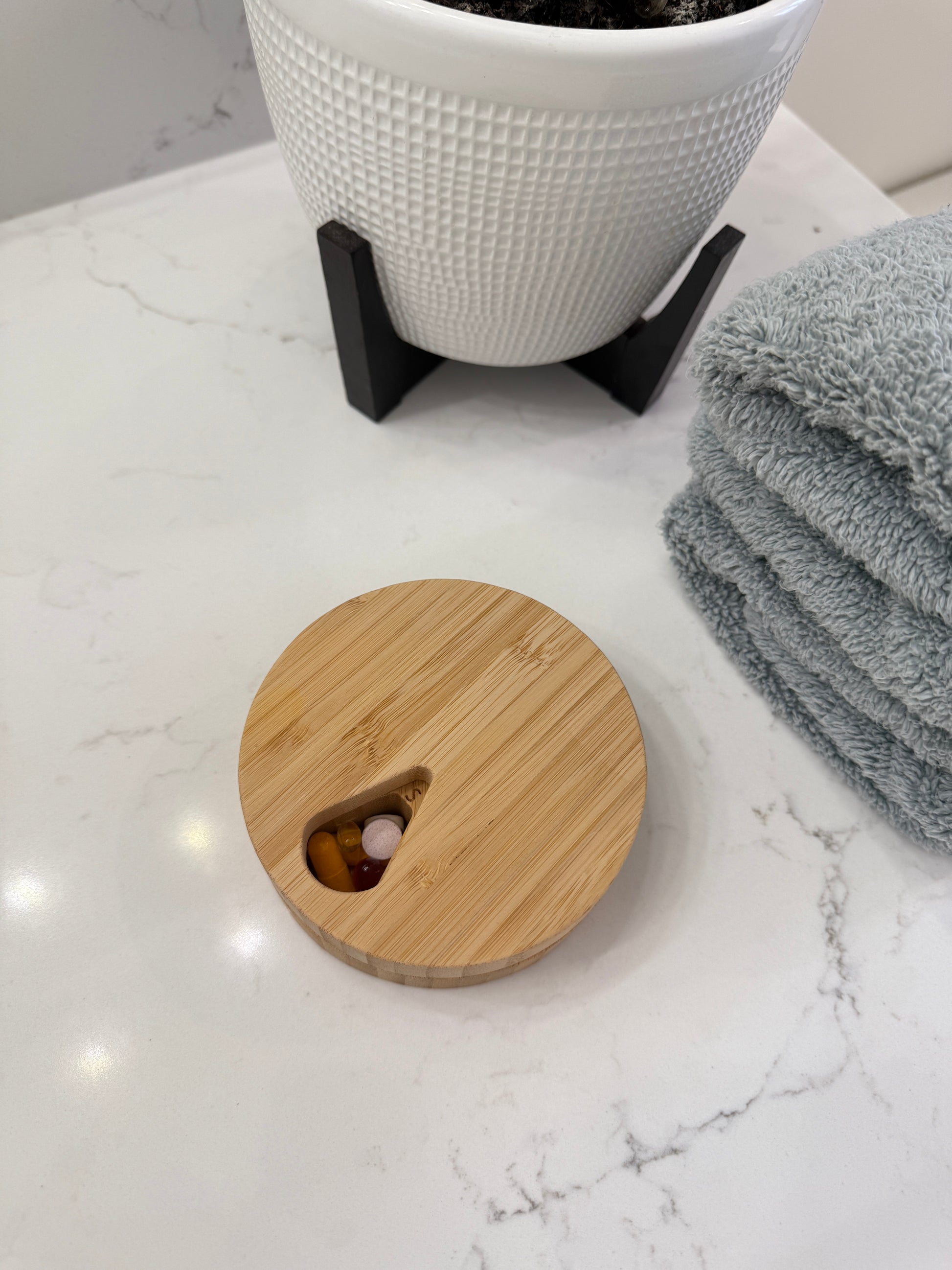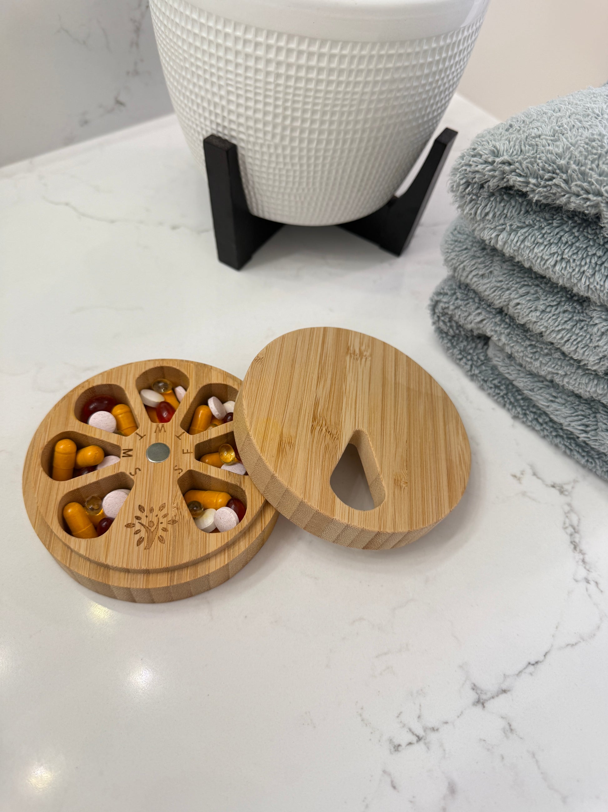 This wooden pill organizer is customized with expert engraving, making it a beautiful and practical addition to your daily routine. With its expert craftsmanship and customized design, it provides a unique and efficient way to organize your pills. Stay on top of your medication with this beautifully crafted organizer.